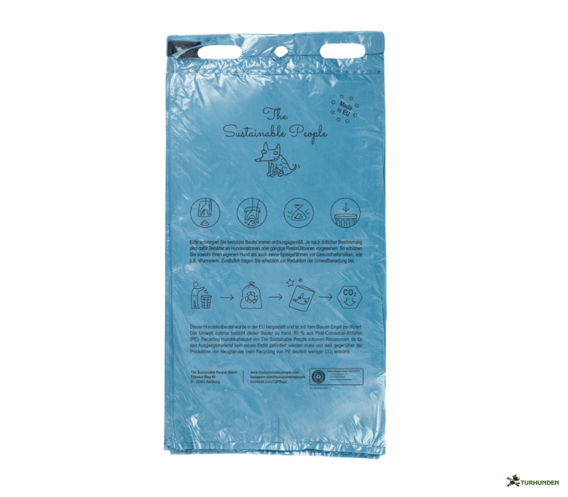 Disse hundeposer fra The Sustainable People er et miljøvenligt og prisvenligt alternativ til traditionelle plastposer. Poserne er fremstillet i EU af mindst 80 % post-consumer genbrugsplast (PE) og bidrager til markant lavere CO₂-udledning sammenlignet med poser lavet af nyt plastgranulat.