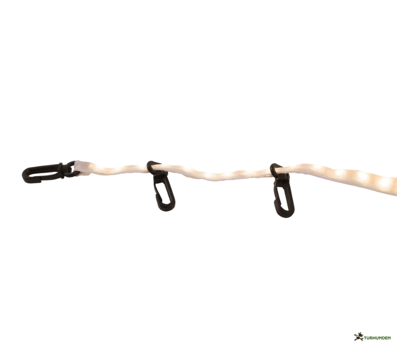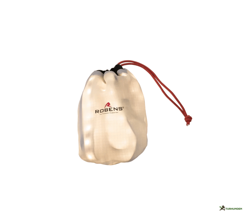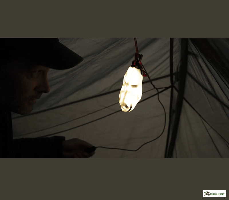 Lyset kan nemt monteres i teltet ved hjælp af de tre justerbare plastkarabiner, så du får jævn belysning præcis dér, hvor du har brug for det. Den medfølgende ripstop-pose fungerer både som opbevaring og som lanterne, hvis du ønsker et mere dæmpet og stemningsfuldt lys i lejren.