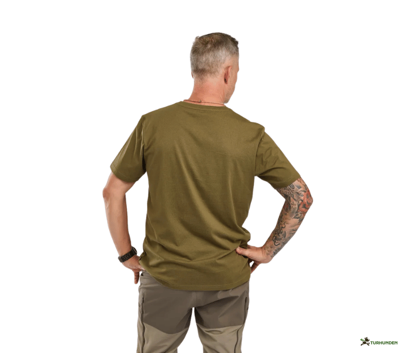 På fronten finder du et stilrent Pinewood-print, som giver T-shirten et klassisk outdoor-udtryk. Den afslappede pasform gør den behagelig at have på hele dagen – både når du går tur med din hund, arbejder i haven eller er på tur i naturen.
