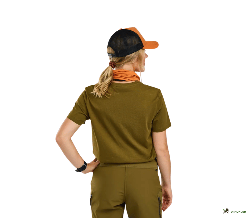 T-shirten har et stilrent elgprint på fronten, som giver et klassisk outdoor-look. Den feminine pasform og den runde hals gør den nem at kombinere med resten af din outdoor-garderobe, enten alene på varme dage eller som lag under en fleece eller jakke.
