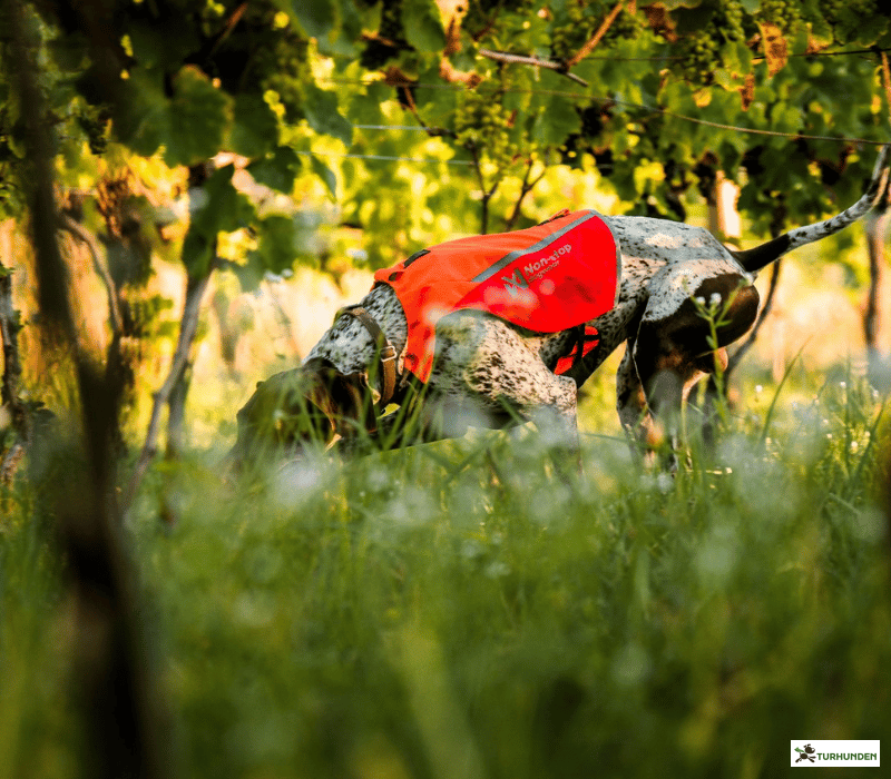 Brystpanelet er forstærket med aramidfiber, som beskytter mod grene, torne og krat. Yderstoffet er fremstillet af slidstærkt ripstop-polyester, og de indbyggede formstivere sikrer, at vesten bevarer sin facon under bevægelse. Den kraftige orange farve med 3M refleksdetaljer gør hunden synlig på lang afstand – også i skumring, regn eller tæt bevoksning.