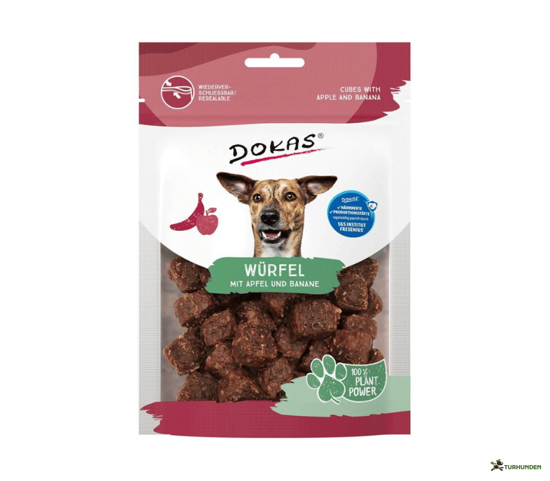 Dokas tern med æble og banan er en lækker, kød­fri godbid lavet af rene, plantebaserede ingredienser. De små tern har en mild og naturlig smag fra frugt og vegetabilske råvarer, og konsistensen gør dem særligt velegnede som træningsgodbidder eller som en lille ekstra snack i løbet af dagen.