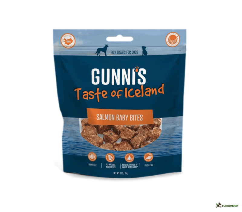Gunnis Mini Bider med laks er små, proteinrige bidder lavet af frisk laks, torsk og kuller fra Islands rene farvande. De lufttørres nænsomt med geotermisk energi, hvilket bevarer både smag, næringsstoffer og de gode fedtsyrer.