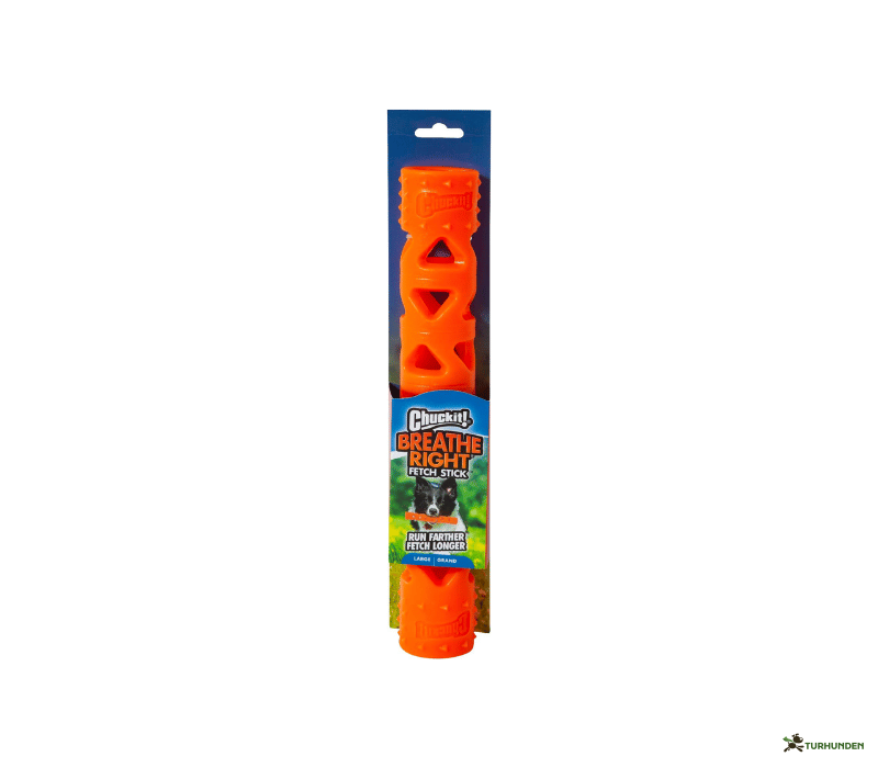 Fås i størrelserne small og large, Chuckit! Air Fetch Stick er lavet af slidstærkt gummi, der er skånsomt for din hunds mund og har en lys orange farve, der gør den let at finde i græs, mudder, sne eller vand!